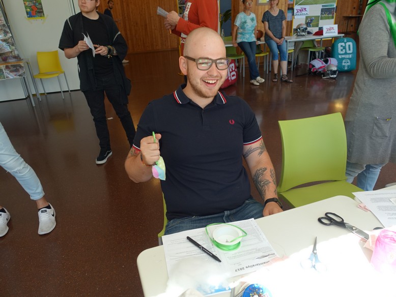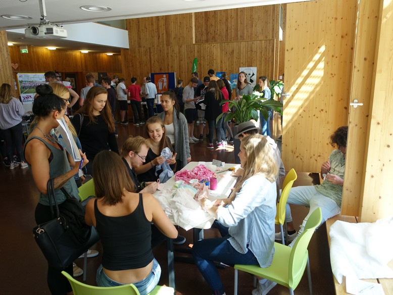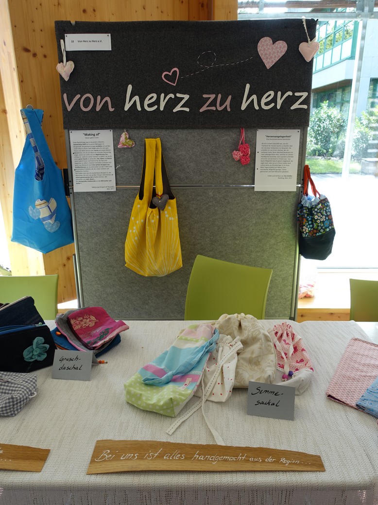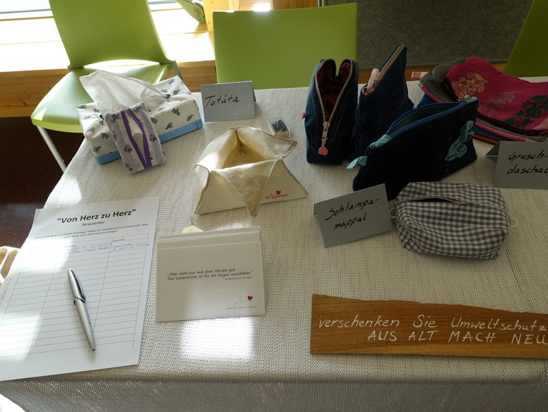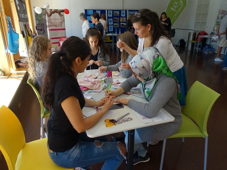 Ein Vormittag, der mich selbst zum Strahlen brachte, war der Ehrenamtstag in Rosenheim, organisiert von der Fachoberschule und Berufsoberschule Rosenheim. Im Vorfeld waren wir gefragt worden, ob wir an diesem Aktionstag den Schüler/-innen vor Ort zeigen wollen, wie sie sich ehrenamtlich engagieren können. Unter den etwa 25 anderen Ausstellern waren wir mit unseren selbstgenähten Dingen zwar ein Exot. Unser Angebot weckte zu meiner Freude allerdingsgroßes Interesse. Die Besucher der Aktionstages durften bei uns eigenhändig ein "Herz für den Frieden" nähen. Manche waren zuerst überrascht, ließen sich dann aber gerne auf die neue Erfahrung ein. Ich dachte, das würde ein großes Tohuwabohu geben, doch die Teilnehmer machten im Gegenteil einen eher meditativen Eindruck. Das Nähen brachte sie ein bisschen runter von ihrem anstrengenden Schul- und Lernalltag. Hier ein paar Eindrücke vom "Do it Yourself"-Herznähen: